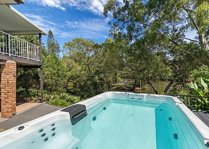La villa Riverfront Oasis In Elanora Gold Coast se encuentra a unos 2 km del Parque de Vida Silvestre David Fleay y ofrece un jacuzzi para disfrutar de una experiencia relajante.